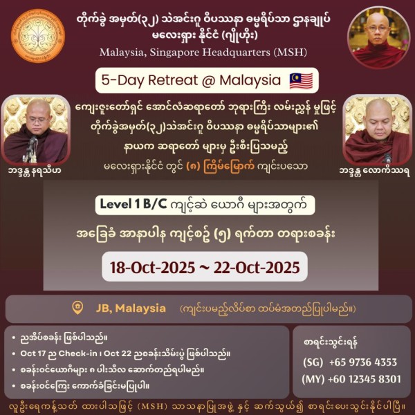 🇲🇾 Malaysia (Johor Bahru) တွင် ၈ကြိမ်မြောက် ကျင်းပမည့် #၅ရက် အထူးတရားစခန်း